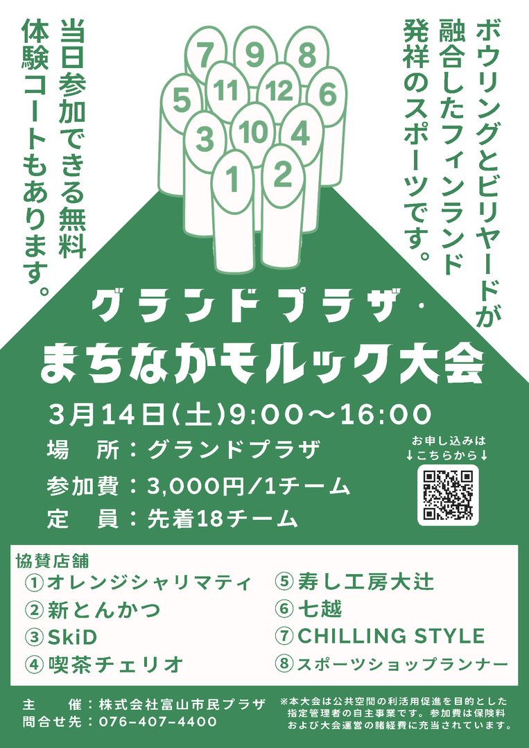 | 参加対象 | モルックに興味のある方、または日頃から楽しんでいるモルッカーの皆さま。初心者・経験者問わず、どなたでも参加できます。 | |