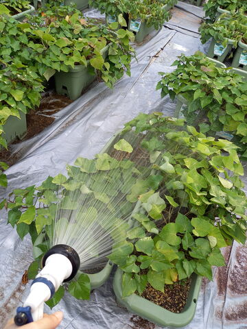 水やり中に、ひょこっと頭を出している さつまいもがいたので、