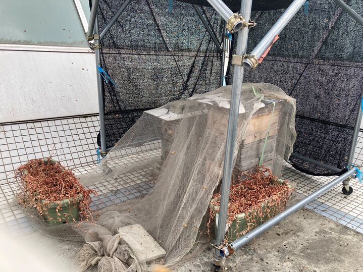 そこで、オオスズメバチは通れず、ミツバチだけが通ることができるネットを巣箱に設置しました。設置直後はミツバチたちも見慣れない白いネットに動揺を隠しきれない様子でしたが、無事に安全を確保できて一安心です。