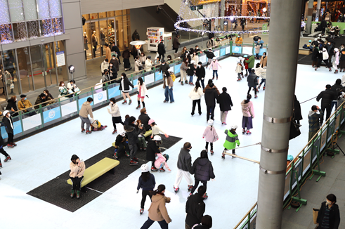リンクの大きさは縦32.7m×横10.4m (約340m²) で、氷の代わりに特殊な樹脂パネルを使用しており、環境にやさしく、気軽にスケートを楽しむことができます。