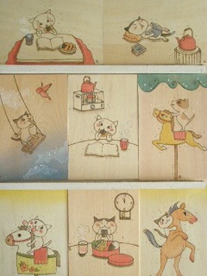 板をカットして、一枚ずつ版画や、電熱ペン、アクリル絵の具で猫絵を描いたハガキです。また、木ハガキスタンドも作ります。