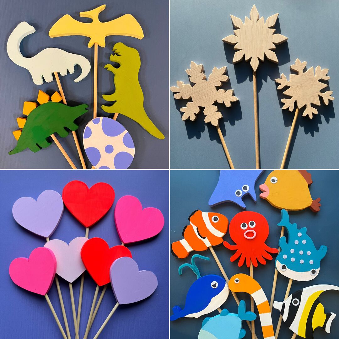 好きなウッドステッキを選び、毛糸やパーツで自由にデコレーションします。