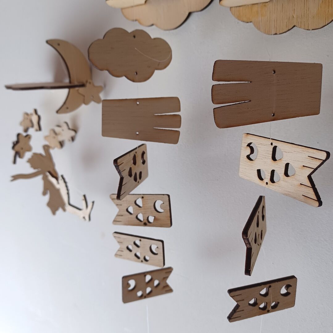 好きな木のパーツを選んで、オリジナルモビールを作ります。木工雑貨の販売もあります。